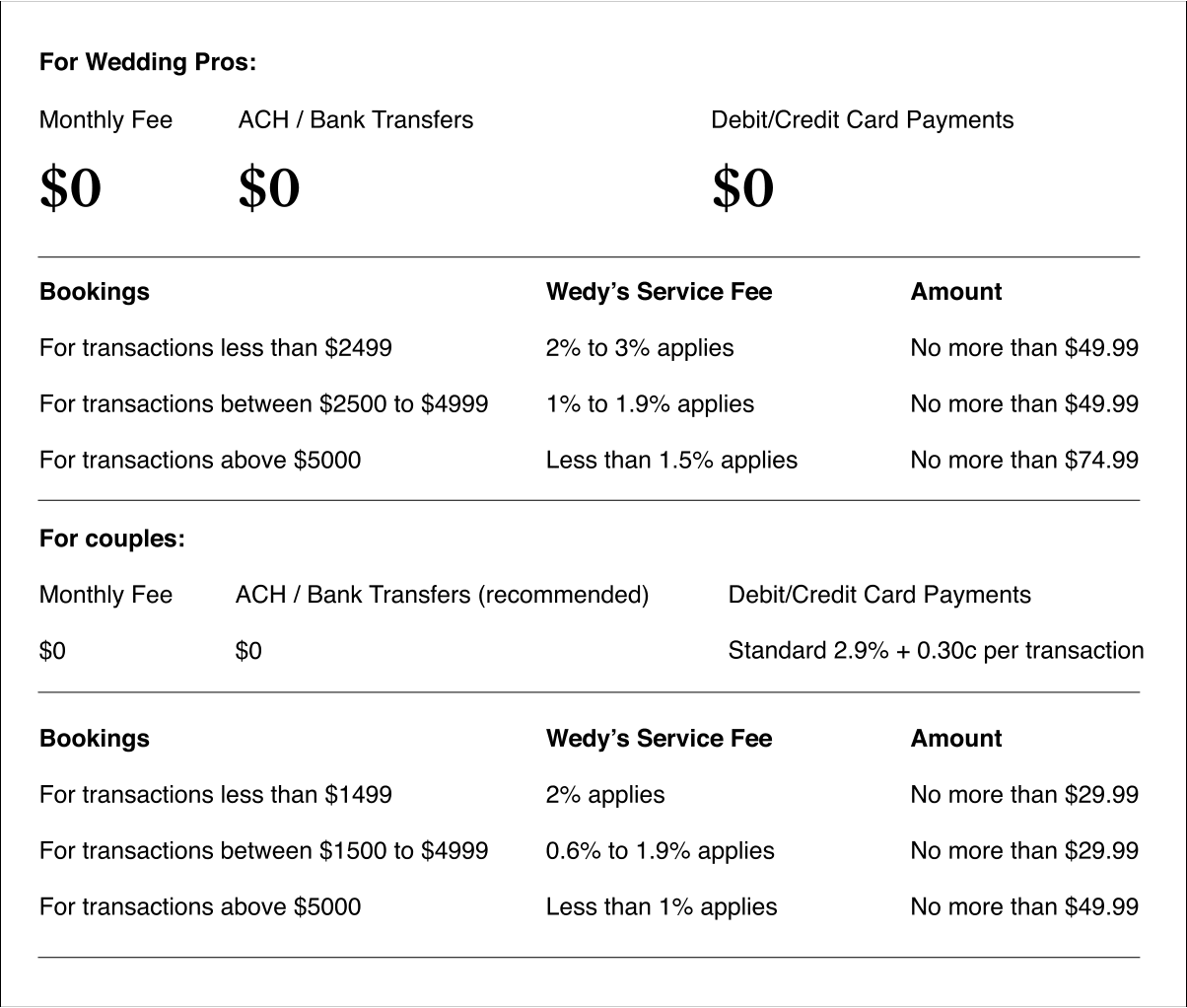 Thank you for using Wedy. This document explains how we invoice our Users, how Vendors collect payment, our service fees and booking fees, and our refunds / cancellation policies. This document is subject in all respects to our Terms of Service (www.wedypay.com/terms) (the "Terms"). Capitalized terms used in this document but not defined have the meanings ascribed to them in the Terms.
